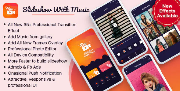 Introducing the "Slideshow With Music," a cutting-edge mobile application designed for creating stunning presentations and captivating memories. This innovative app allows users to transform images and videos into professional-quality slideshows that are enhanced with over 35 new professional transition effects and a variety of music options. Perfect for anyone looking to showcase personal events, business presentations, or creative projects, this app elevates your visual storytelling to new heights.