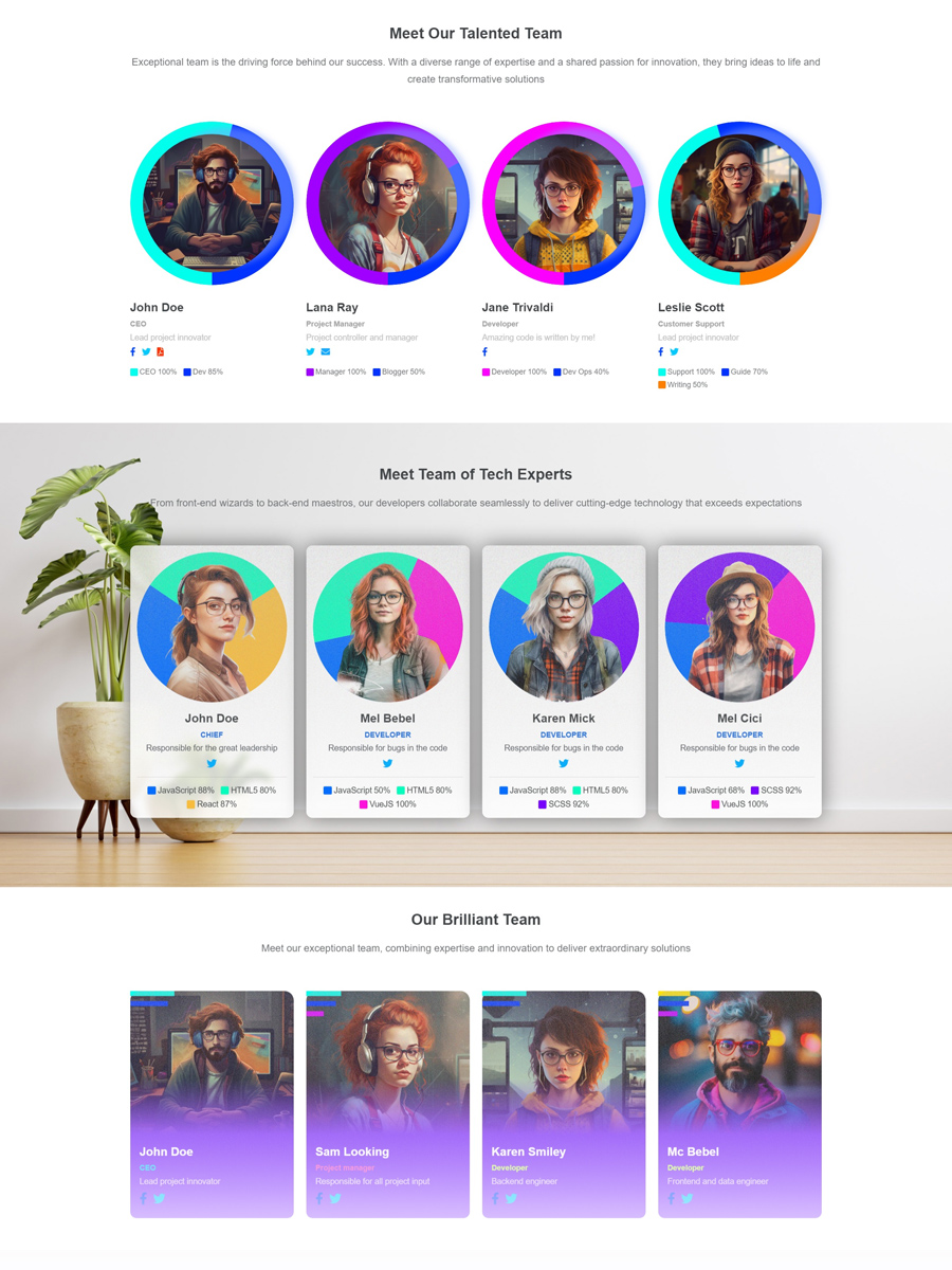 - Fully Responsive: Ensures your team cards look stunning on all devices, from desktops to smartphones, providing a seamless experience for your visitors.